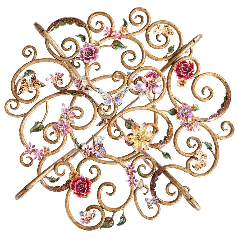Wrought iron structure and inner scrolls from Asia. Flora and Fauna designs casted in pewter and finished in 14K Gold in Rhode Island. Enameling and stone setting with Swarovski® crystals at the Jay Strongwater Rhode Island workshop. ½” inch beveled glass top.