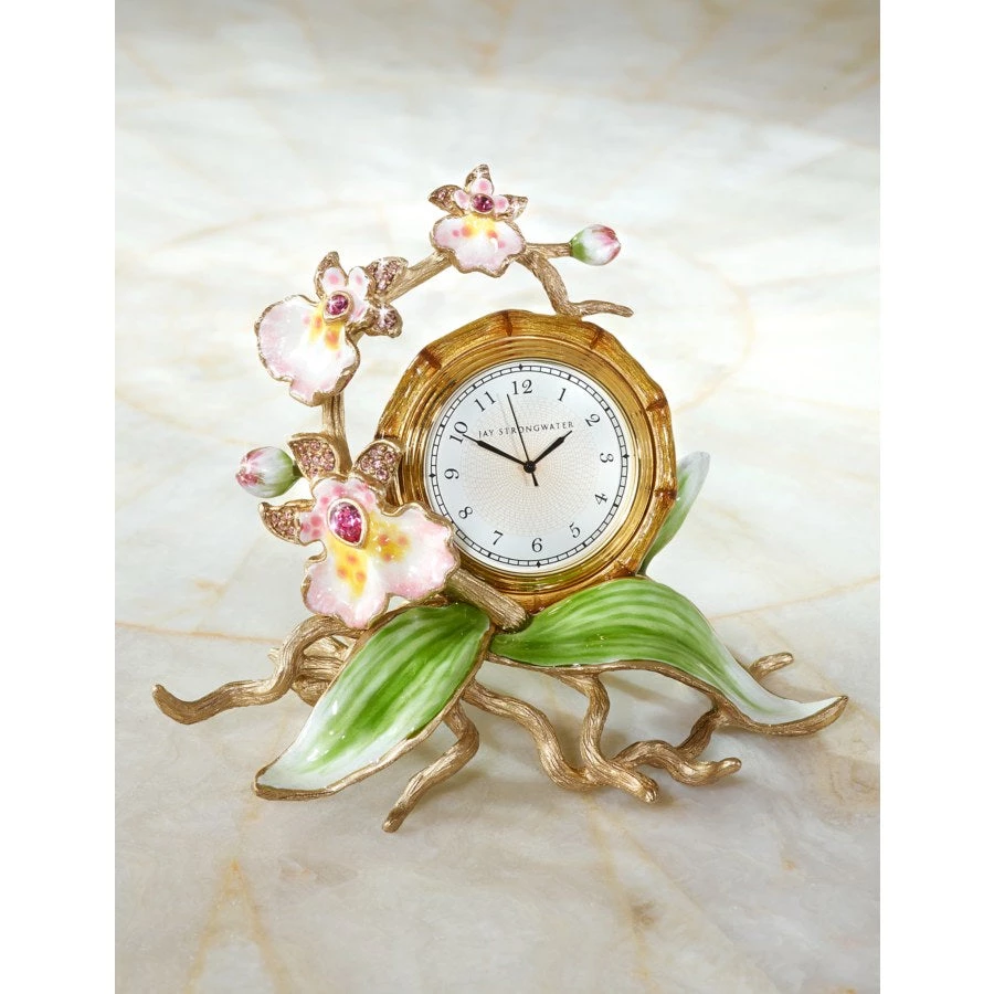 A fresh new way to start your day is with our Tara Flora Orchid clock. Translucent spring-green enamels drip over the 14K-gold-finished metal frame with Swarovski® crystal edgings. Crafted in Rhode Island and New York. Beautifully finished on both sides.