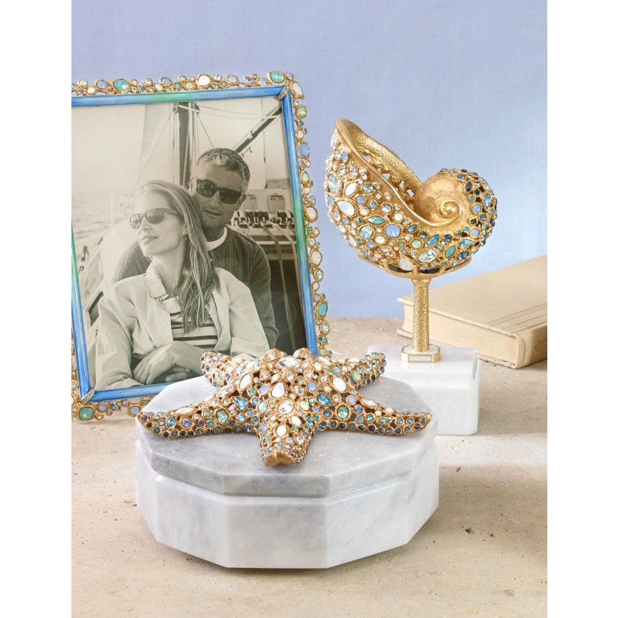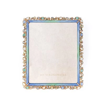 Crafted of pewter with a 14K matte gold finish, the Theo Bejeweled 8″ x 10″ Frame is a treasure inspired by the sea. Hand-enameled and hand-set with Swarovski®’s finest large, faceted crystal stones in shades of white opal, aquamarine, and light azure in New York and Rhode Island.