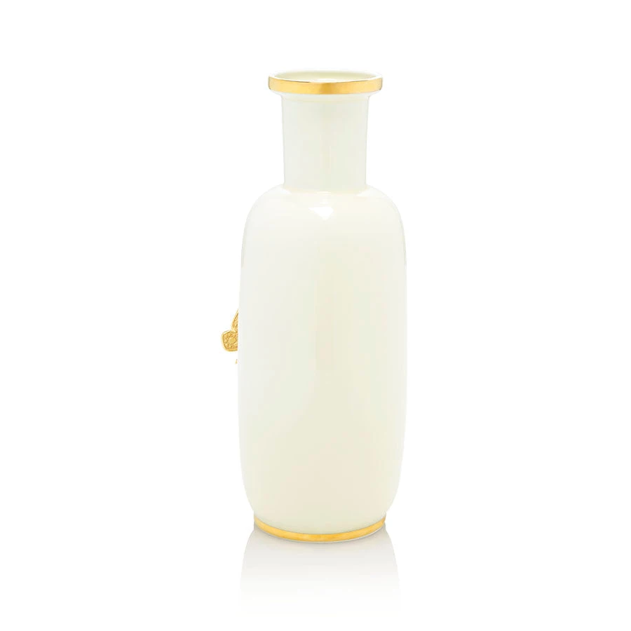 In the Composition collection, we set aside our enamels and crystals allowing the natural beauty of the carved metals to shine through. An exuberant carved metal tulip dramatically drapes over the Addilyn cream glazed porcelain vase. The engraved tulip and butterfly are casted in pewter and hand-polished by our master artisans in Rhode Island and fixed onto a cream glazed porcelain vase with high-fired gold edging and crafted in Portugal.